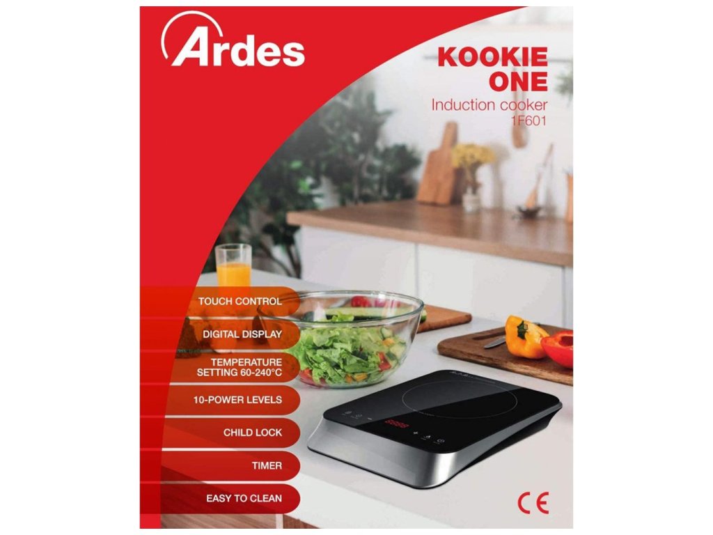 Indukční vařič Ardes 1F601 s příkonem 2000 W, počet plotýnek 1 ks, průměr plotny 26 cm, počet programů 10, termostat, ochrana proti přehřátí, automatického vypnutí, světelný indikátor provozu, dětská pojistka, automatická detekce nádobí, časovač, LCD displej, dotykové ovládání a nastavení teploty, rozměry 38,5 cm x 28,7 cm x 6,4 cm Poškozený přepravní obal (krabice, polystyren či plastová folie).Jedná se o nový, plně funkční výrobek, na který se vztahuje standardní, minimálně dvouletá, záruka.