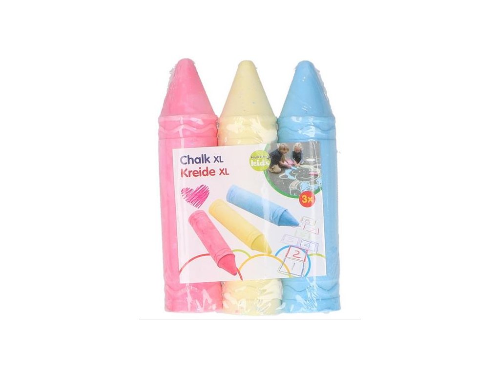 Barevné kulaté křídy pro kreslení na chodník. Jsou snadno smývatelné vodou a splňují veškeré evropské normy. Balení obsahuje tři kusy velkých kříd. Probuďte v dětech fantazii! Vhodné pro děti od 3 let. Délka 19 cm.