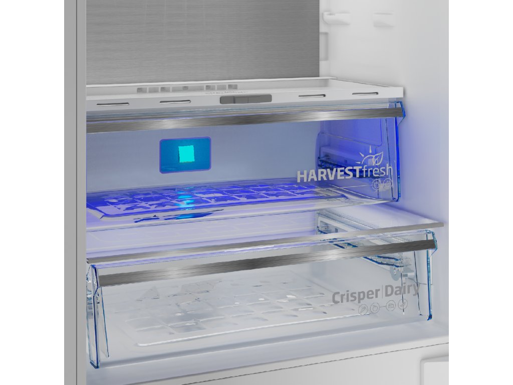 Speciální světelný režim přihrádky HarvestFresh™ kopíruje střídání světla a tmy během celého dne. To udrží v chodu přirozené procesy v ovoci a zelenině, takže se uchová více vitamínů i chuti, než kdyby byly jen zavřené ve tmě. Díky tomu není potřeba každý den nakupovat a zdravá svačinka je stále při ruce.