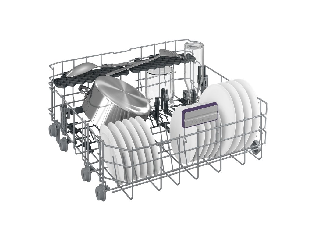 Upravte výšku horního koše pohodlně, aniž byste museli přeskládávat celou myčku. Koš Acrobat lze nastavit do tří různých výšek i ve chvíli, když je plný nádobí. Pomocí zmáčknutí klapky na každé straně uvolníte aretaci koše a můžete jej posunout nahoru a dolů.