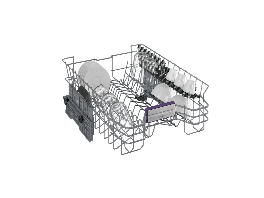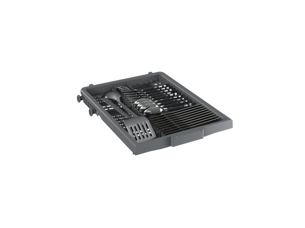 Příborová přihrádka poskytuje dostatek prostoru pro rozložení příborů a drobného nádobí a je vybavená i vlastním sprchováním. Díky příhrádce lze pak vyjmout koš na příbory ze spodního koše a získat další místo pro velké kusy nádobí.
