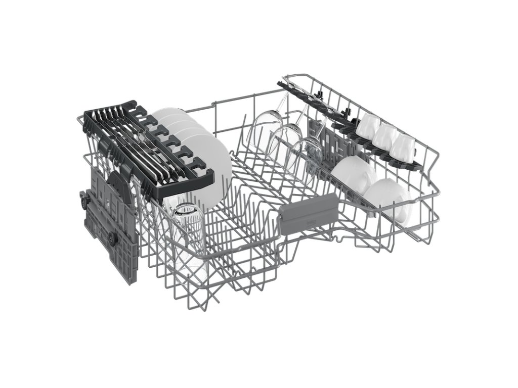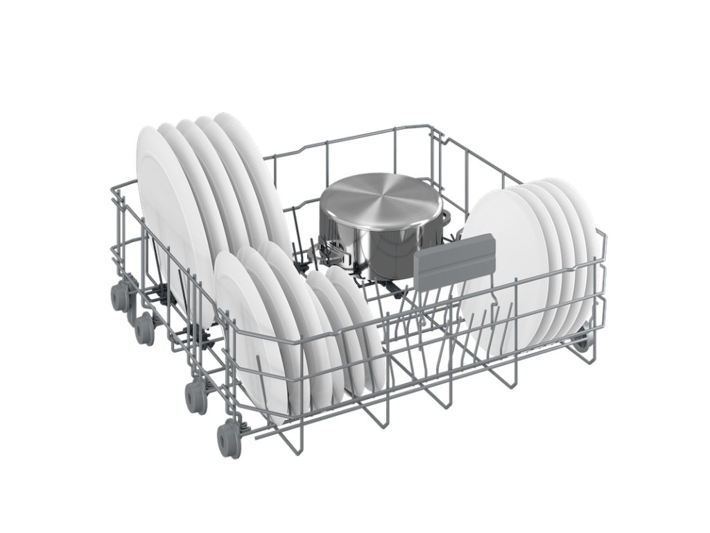 Upravte výšku horního koše pohodlně, aniž byste museli přeskládávat celou myčku. Koš Acrobat lze nastavit do tří různých výšek i ve chvíli, když je plný nádobí. Pomocí zmáčknutí klapky na každé straně uvolníte aretaci koše a můžete jej posunout nahoru a dolů.