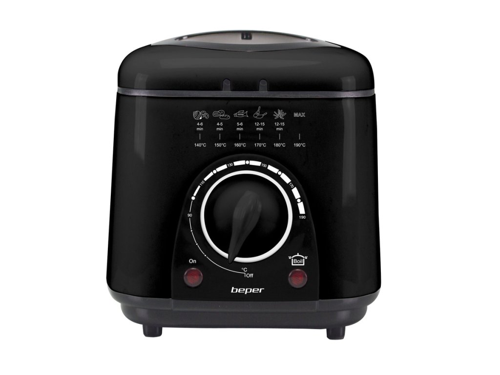 Kompaktní mini elektrická fritéza o objemu 1 l s vnějším tělem z ABS a s nepřilnavou vnitřní nádobou.