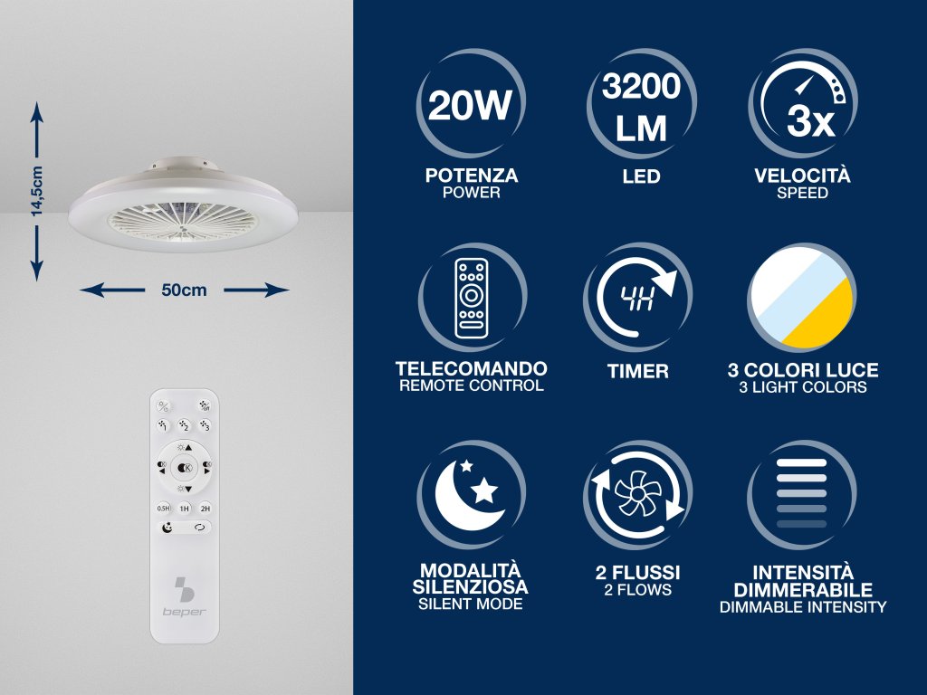 Beper P206VEN640 stropní ventilátor 50cm s LED světlem 3200lm