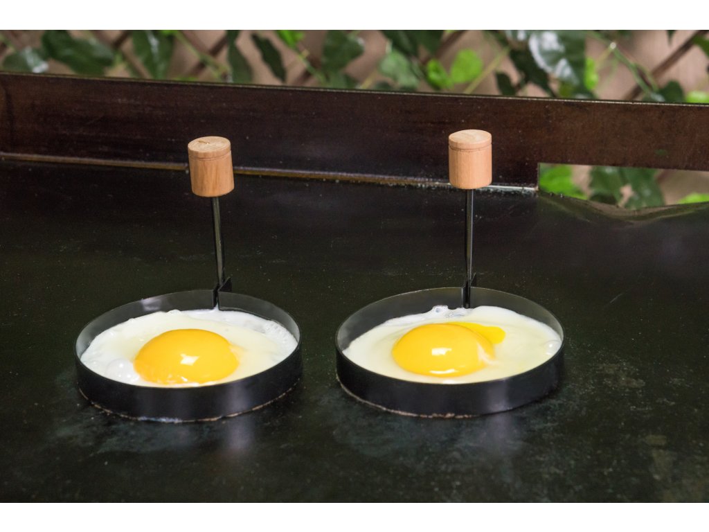 - Dvě kroužky na vejce (egg rings) o průměru 10 cm – pro rovnoměrné vejce nebo malé lívance, se skládací dřevěnou úchytkou
