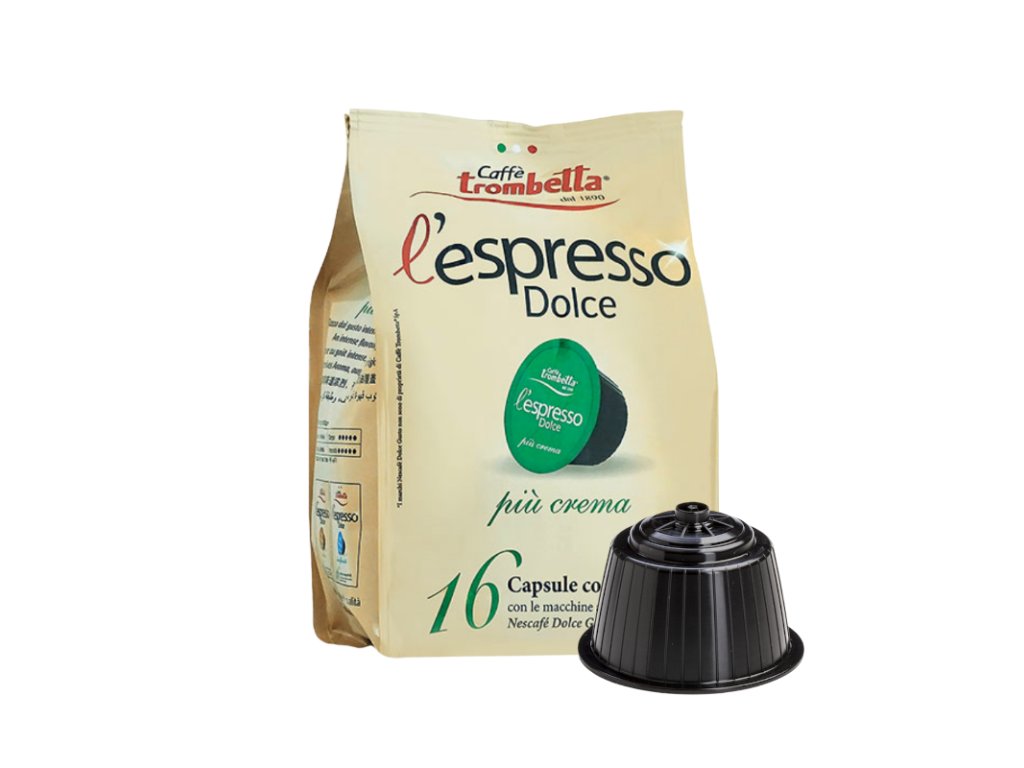 Caffè Trombetta – Più Crema je směs prémiových kávových zrn, která byla pečlivě vybrána pro dosažení bohaté a intenzivní chuti. Tato směs je charakteristická svou výraznou cremou, která je výsledkem kombinace kvalitních zrn a speciálního pražení. Kapsle jsou kompatibilní s domácími kávovary Nescafé Dolce Gusto®, což umožňuje snadnou přípravu autentického italského espressa přímo ve vašem domově.