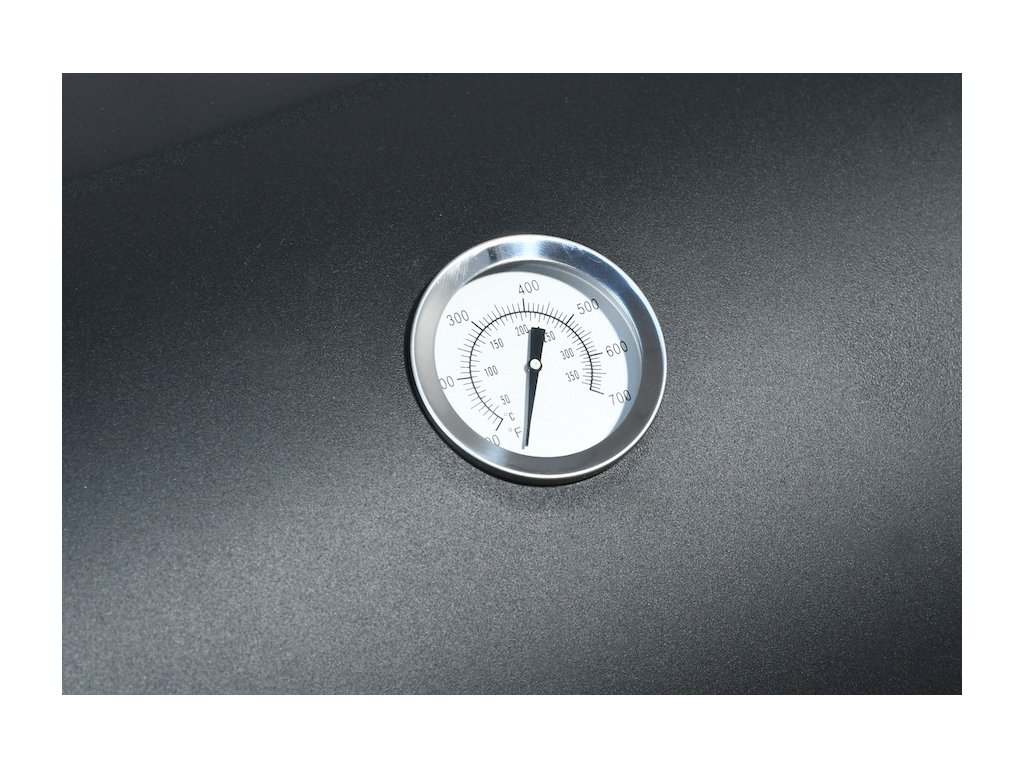 - Víko je opatřené vestavěným teploměrem pro kontrolu teploty, rozměrná grilovací plocha s chromovanou mřížkou a praktická odkládací police v přední části grilu zajistí pohodlnou přípravu pochutin.