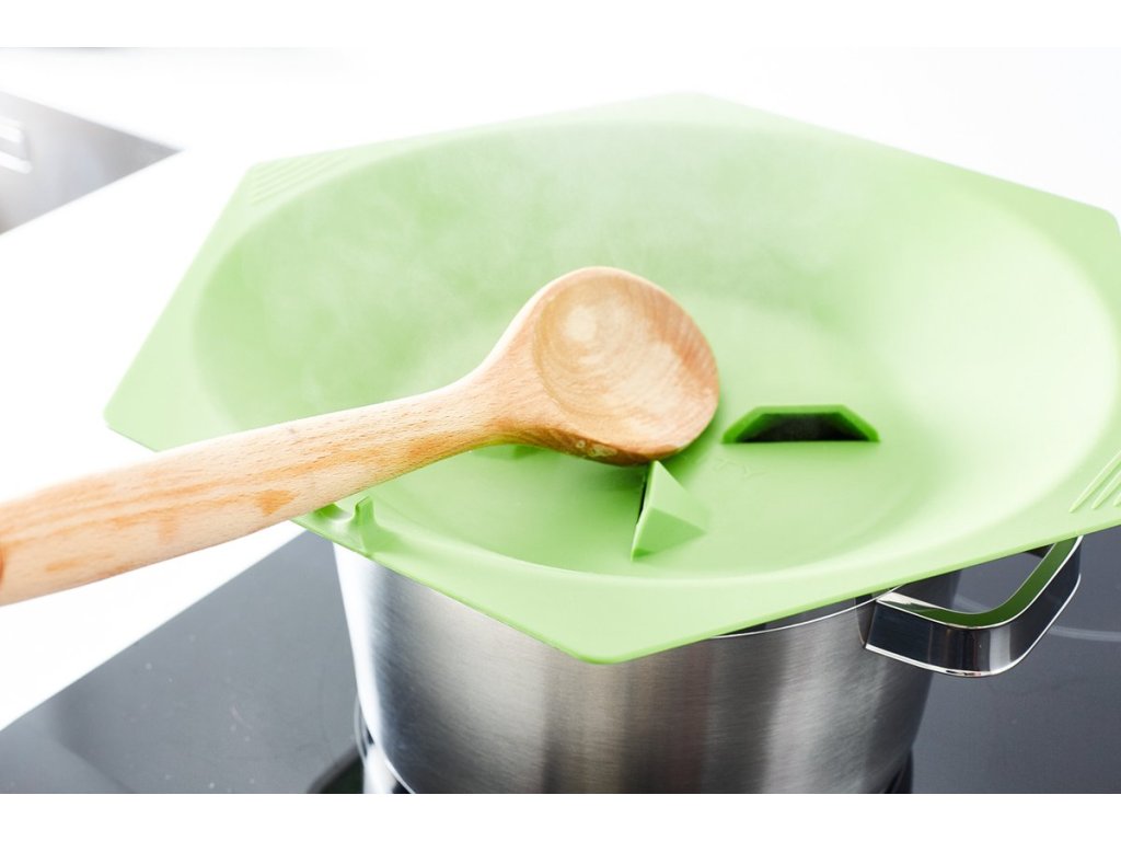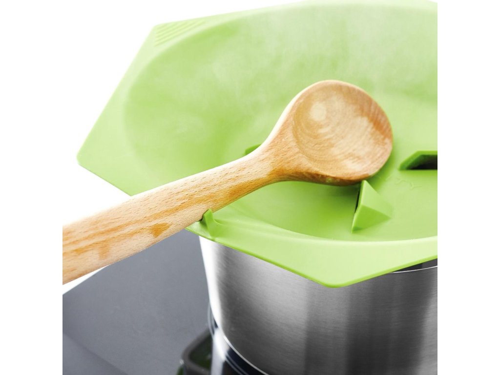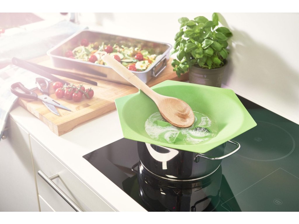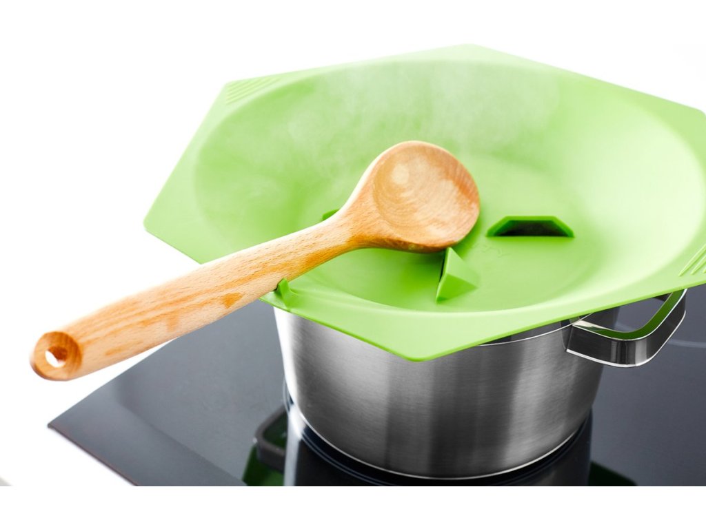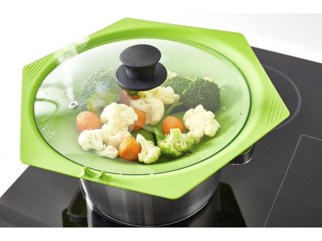 Chránič proti převaření je pružná, ale pevná poklička, kterou můžete nasadit na hrnec. Otvory umožňují únik par a zabraňují tak převaření. Chránič zajišťuje, že se vařící voda může snadněji odpařovat, zatímco voda v hrnci si udržuje teplotu. Už žádné skvrny od vody na sporáku. Chránič proti převaření se hodí na mnoho různých hrncůa snadno se čistí. Na chrániči je možné vařit jídlo také v páře.