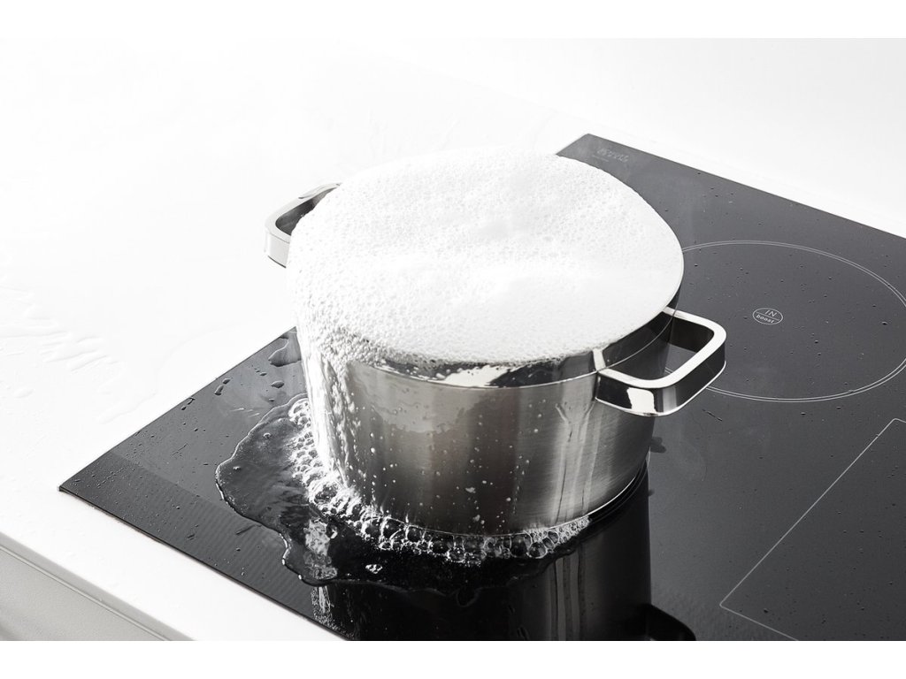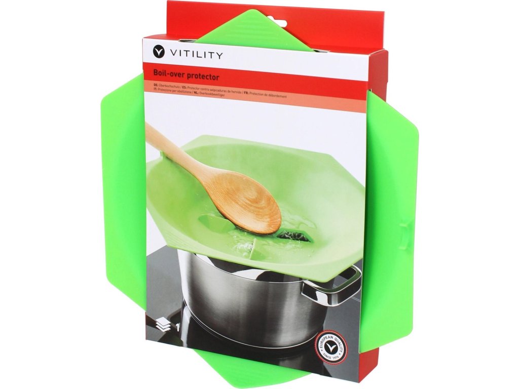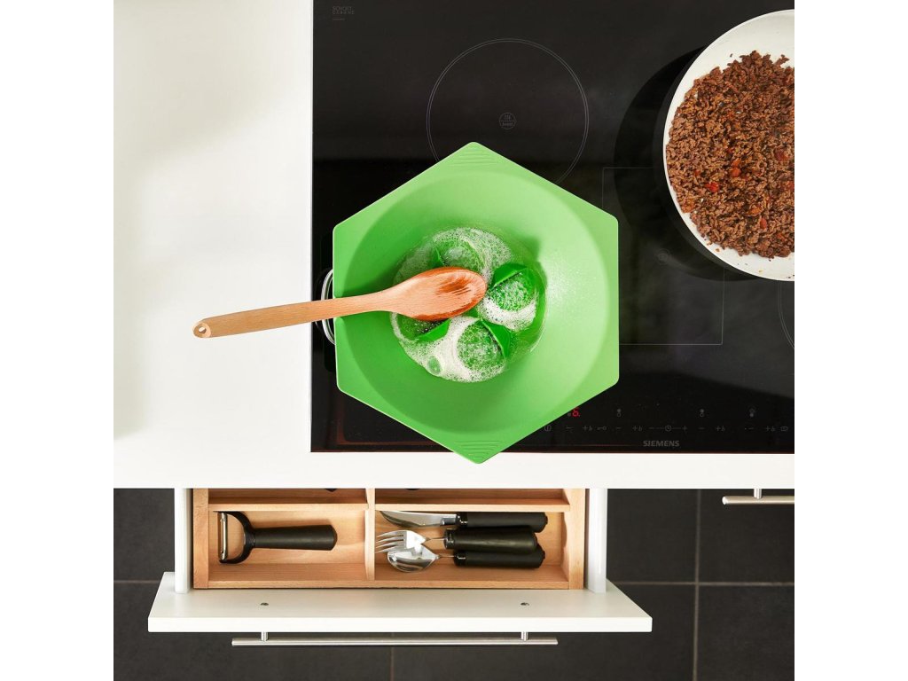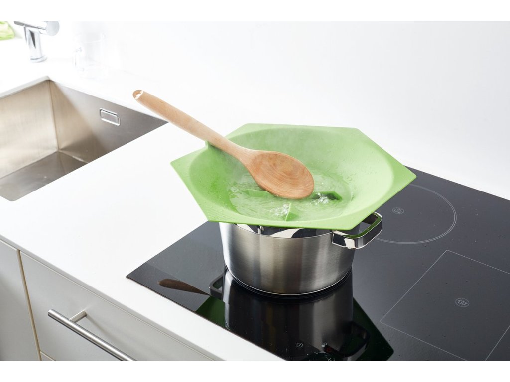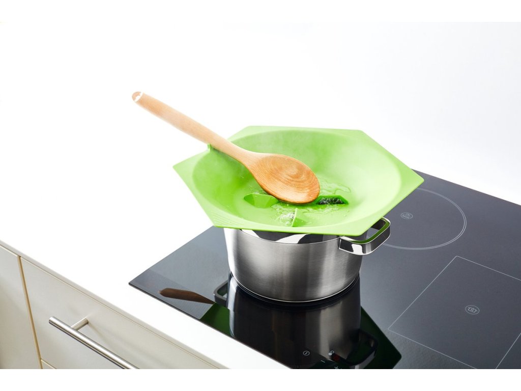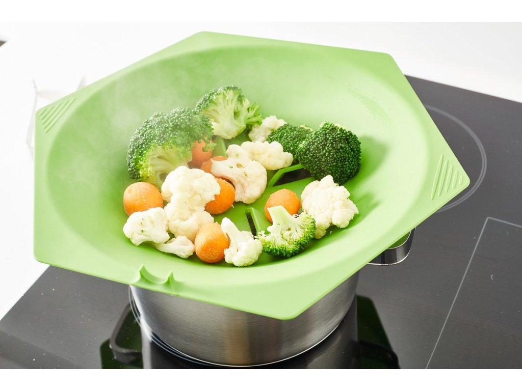 Chránič proti převaření je pružná, ale pevná poklička, kterou můžete nasadit na hrnec. Otvory umožňují únik par a zabraňují tak převaření. Chránič zajišťuje, že se vařící voda může snadněji odpařovat, zatímco voda v hrnci si udržuje teplotu. Už žádné skvrny od vody na sporáku. Chránič proti převaření se hodí na mnoho různých hrncůa snadno se čistí. Na chrániči je možné vařit jídlo také v páře.