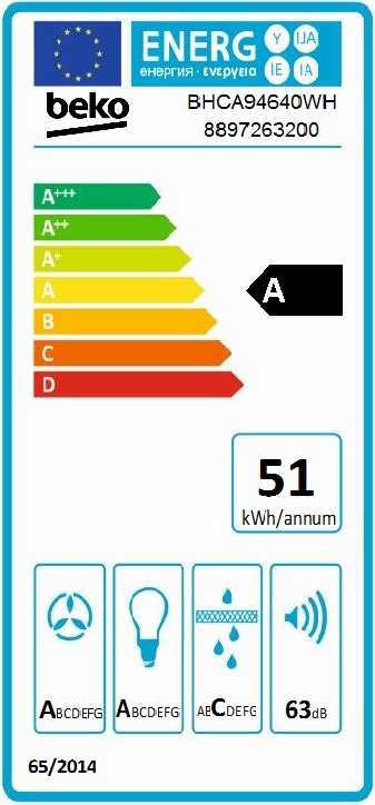 Šikmý 90 Cm odsavač Beko BHCA 94640 WH v energetické třídě A s LED osvětlením a funkcí automatického vypnutí.