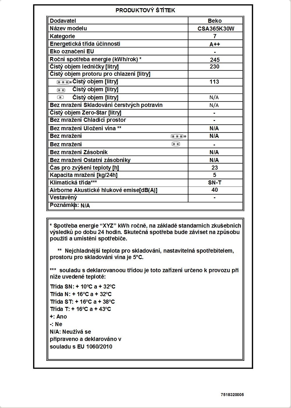 Kombinovaná moderní volně stojící chladnička Beko CSA 365 K30W s mrazničkou dole. Energetická třída A++ se postará o pořádnou úsporu energií a Vaše peněženka tolik neutrpí. LED vnitřní osvětlení zajistí dokonalý přehled nad obsahem a efektivním uspořádáním chladničky. Antibakteriální úprava těsnění udrží Vaše potraviny v bezpečí.