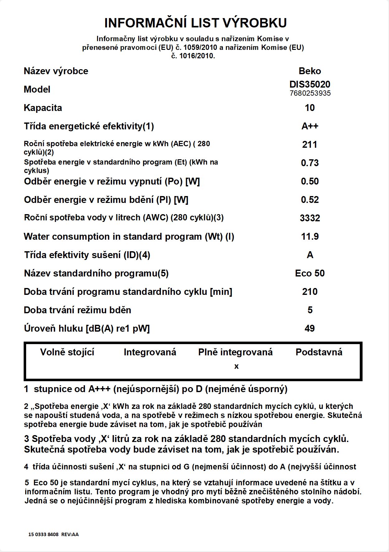 Vestavná myčka nádobí Beko DIS 35020 v energertické třídě A++ na 10 sad nádobí s DirectAccess volbou programů, 5 programy mytí, LED displejem s dotykovým ovládáním, funkcí pro poloviční náplň a extra sušení.