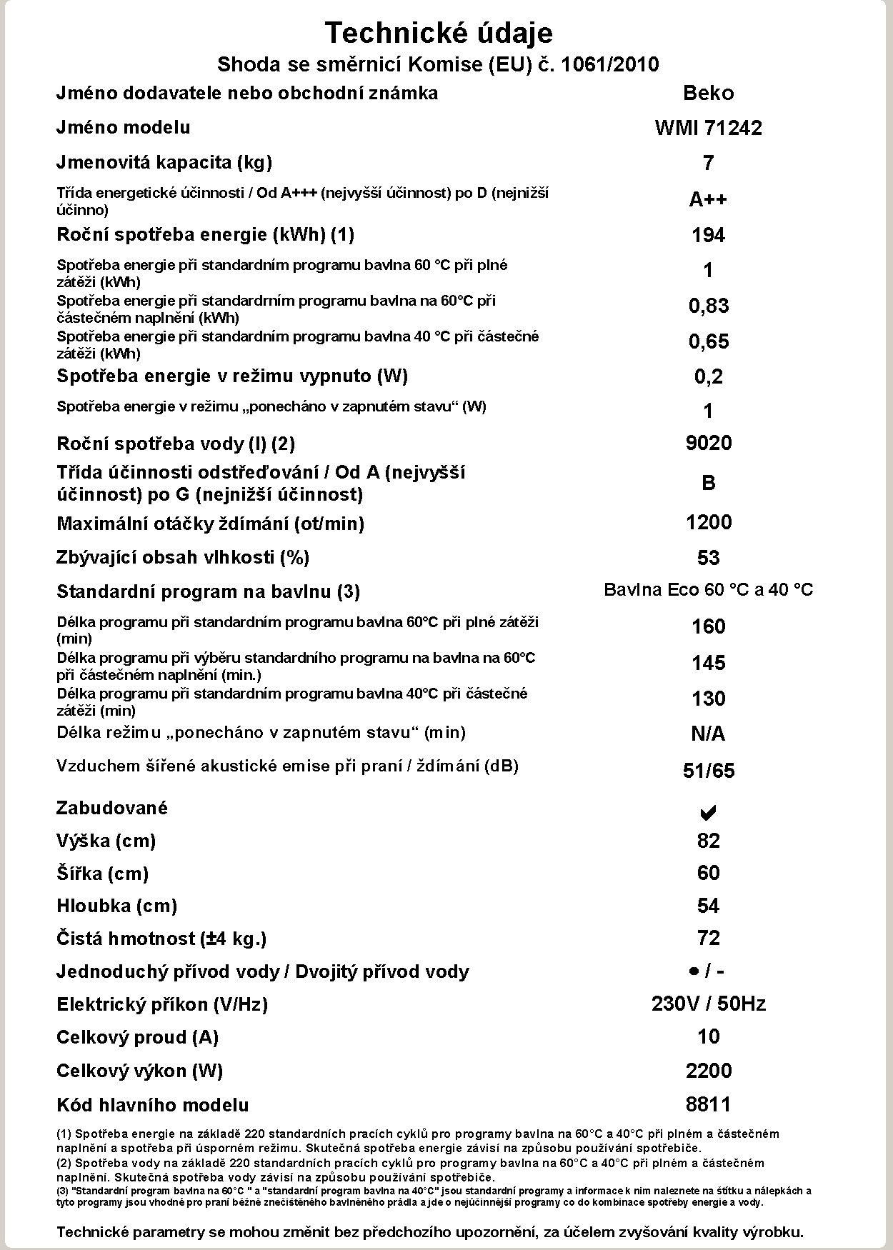 Předem plněná vestavná pračka Beko WMI 71242 pojme až 7kg prádla. Tato pračka vhodná do větších domácností potěší především velmi tichým chodem a energetickoku šetrností. Pračka má Hi-Tech topení, které je pokryto speciální ochranou vrstvou z niklu, která zaručuje odolnost vůči korozi – díky tomu topné těleso vydrží až 100× déle než u běžné pračky. Pračka disponuje funkcí AquaFusion, která zajišťuje mimořádně efektivní využití pracího prášku. Vše pohodlně nastavíte na přehledném LCD displeji.