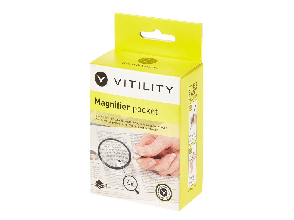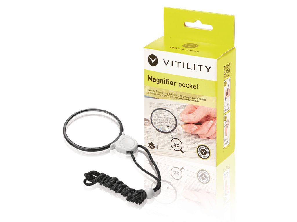 Čtecí lupa Vitility se 4 násobným zvětšení. Lupa je dodávána s praktickou šňůrkou na krk a ochranným pouzdrem.