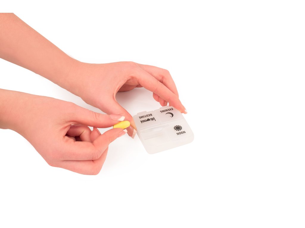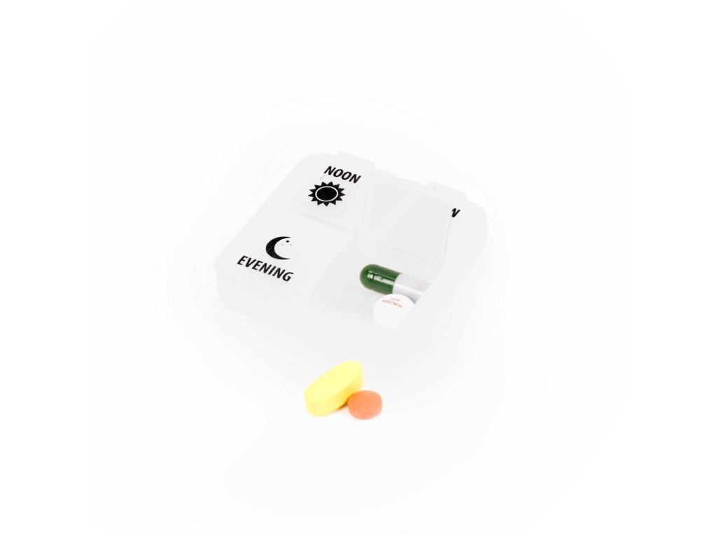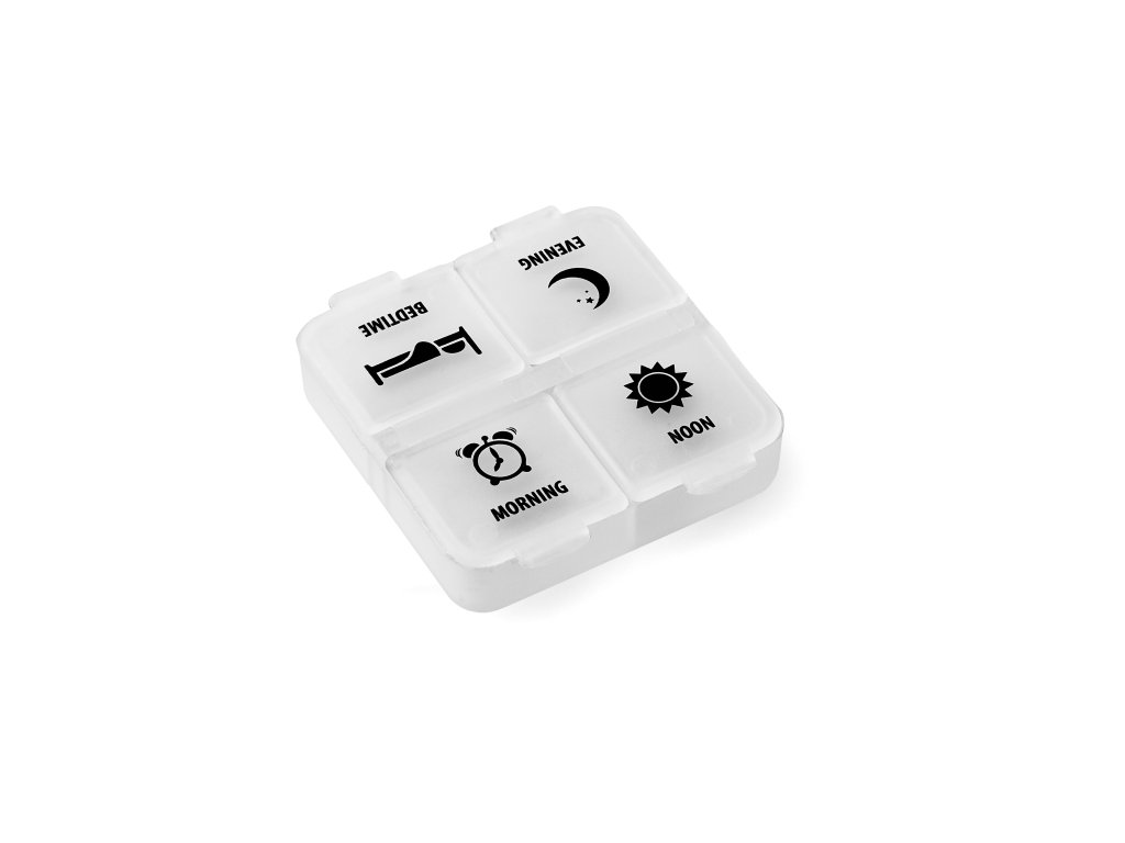 Tato krabička na léky pojme léky na jeden den. Krabička na léky má čtyři samostatné přihrádky rozdělené na ranní, odpolední, večerní a na spaní. Tímto způsobem lze léky uchovávat odděleně a pohodlně je uspořádat na různé části dne.