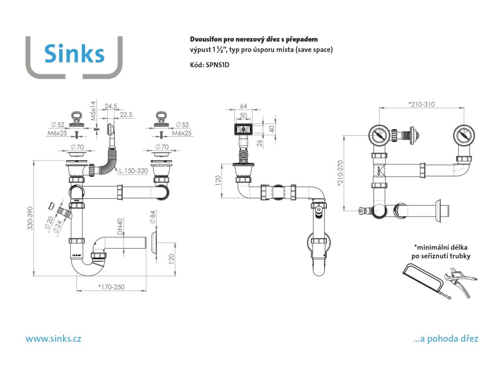 Dvousifon 1 1/2" pro nerez. dřezy s úsporou místa