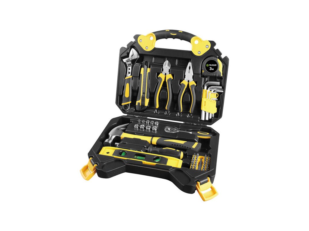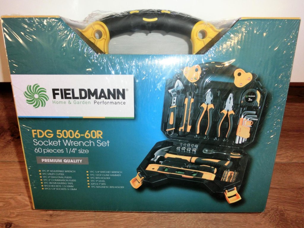 Gola sada Fieldmann FDG 5006-60R obsahuje: 1x 8" Nastavitelný klíč, 1x Odlamovací nůž, 1x 6" Diagonální kleště, 1x 6" Kombinované kleště, 1x 3M Měřící pásmo, 9 Ks Imbusových klíčů: 1,5-10 MM, 9 Ks 1/4" Hlavice: 5-13 MM, 1x 1/4" Momentový klíč, 1 Ks 340G Tesařské kladivo, 1x Držák bitů, 1x 9" Vodováha, 32 Ks 1" Bitů, 1x Magnetický držák bitů. Poškozený přepravní obal (krabice, polystyren či plastová folie). Jedná se o nový, plně funkční spotřebič, na který se vztahuje standardní, minimálně dvouletá, záruka.