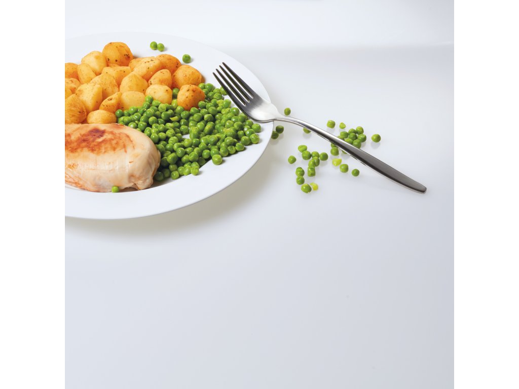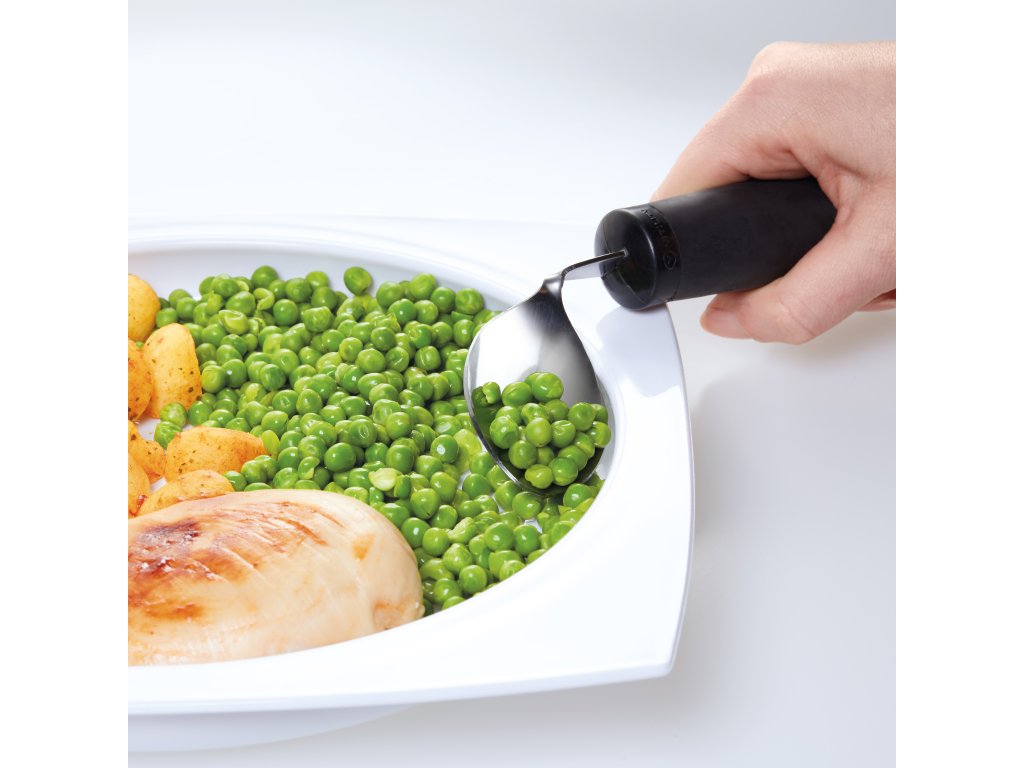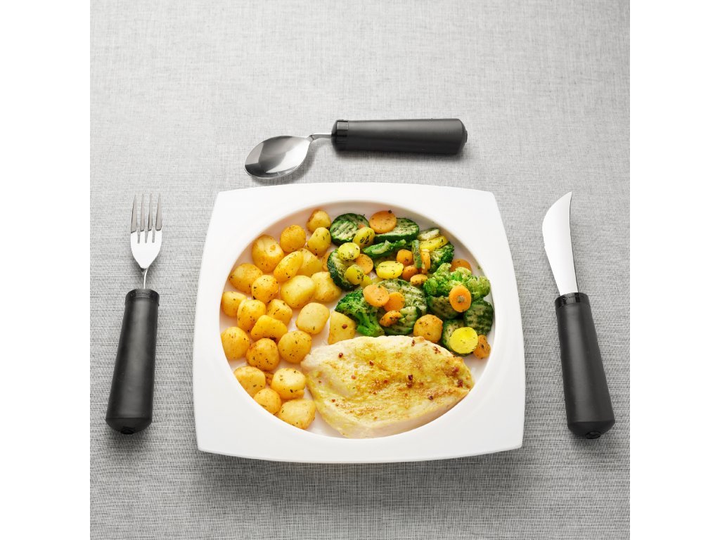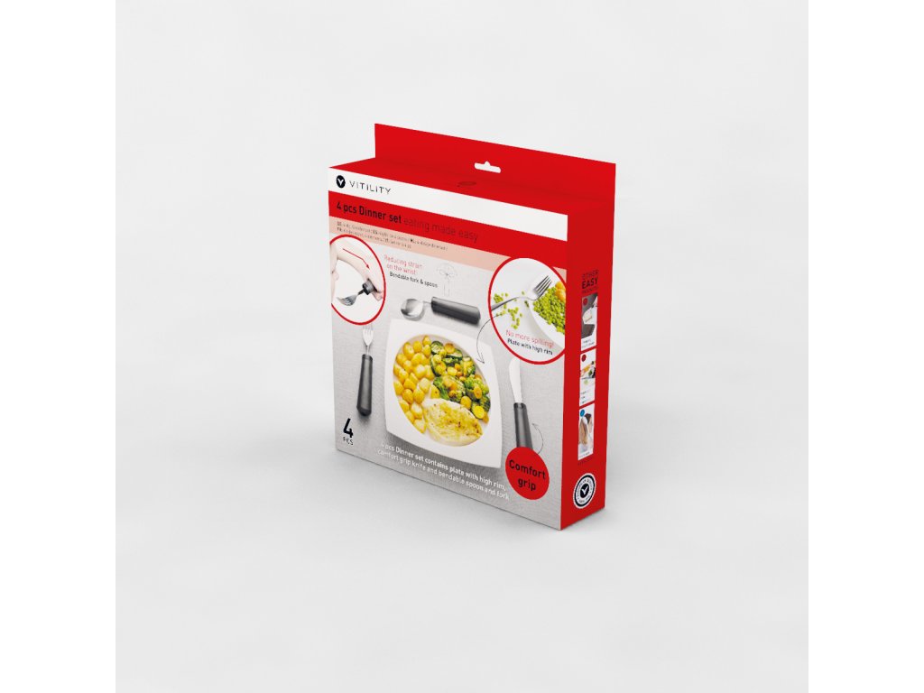 Tato 4dílná jídelní sada je určena pro osoby se sníženým pohybem rukou. Pohodlné protiskluzové rukojeti poskytují větší jistotu při stravování. Sada obsahuje talíř, nůž a ohebnou lžíci a vidličku. Talíř má vyvýšený okraj, který zabraňuje pohybu nebo posunutí jídla z talíře.