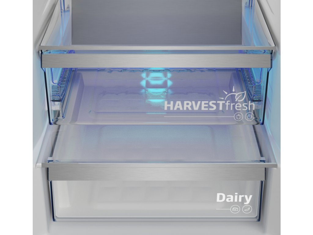 Světelný režim přihrádky HarvestFresh™ kopíruje střídání slunečního světla a tmy během celého dne. To udrží v chodu přirozené procesy v ovoci a zelenině, takže se uchová více vitamínů i chuti, než kdyby byly jen zavřené ve tmě. Uskladněné ovoce a zelenina tak brzy nevadne, nezkazí se dříve, než se sní, a ulehčí časté nakupování.