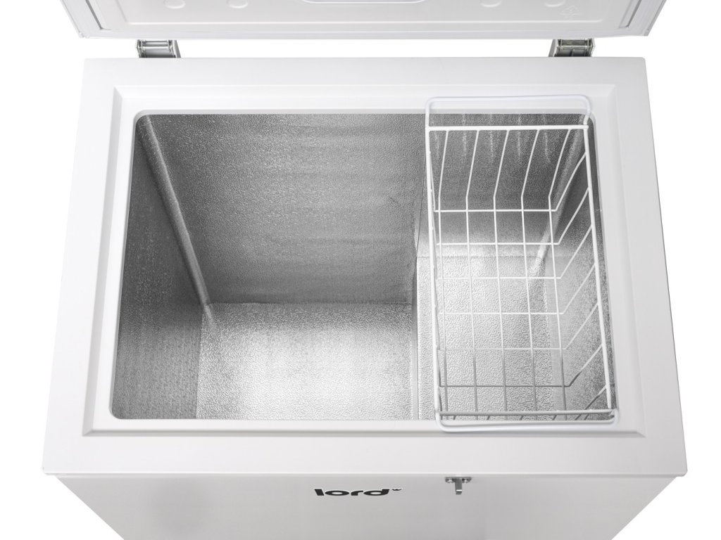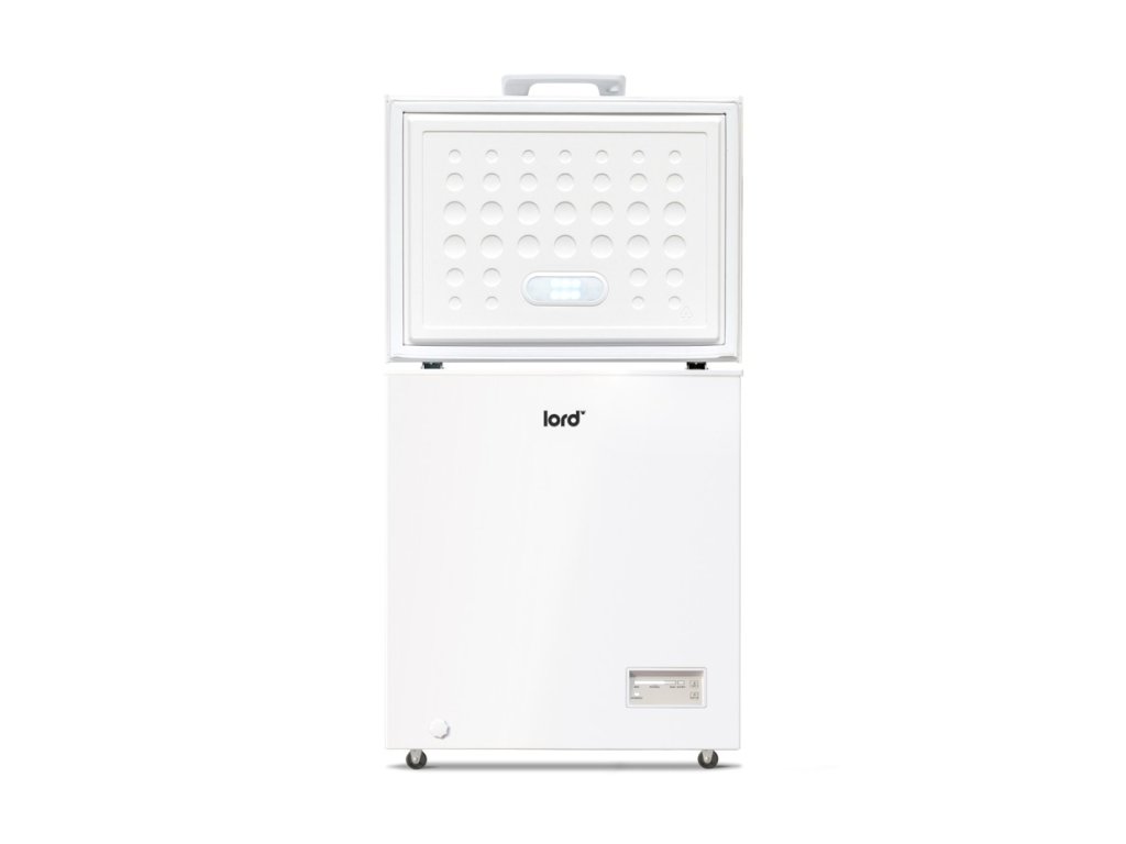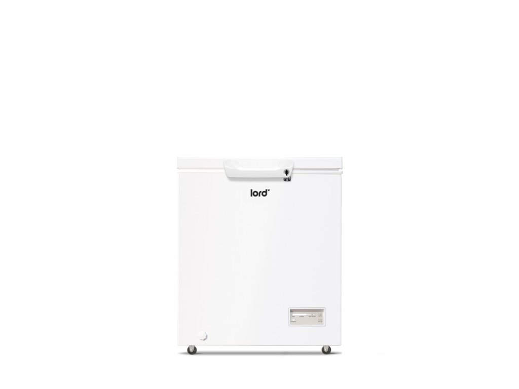 Truhlicová mraznička LORD G1, Spotřeba el. energie: 182 kWh/rok, Objem celkem: 142 l, Hlučnost: 40 dB(A)re 1 pW, Klimatická třída: SN-ST (+10°C až +38°C), Způsob ovládání: elektronické ovládání, Způsob odmrazování: ruční, Invertor BLDC kompresor, Frost Protect, Koše standardně: 1x kovový, Ergonomické madlo se zámkem, Kolečka, Barevné provedení: bílá Poškozený výrobek.