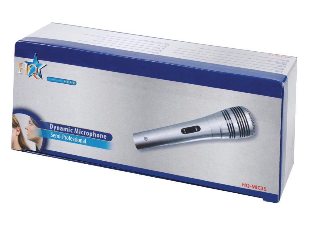 Dynamický mikrofon HQ-MIC35 s kardioidní "unidirectional" směrovou charakteristikou pro hobby použití. Konektor XLR, celokovové tělo s vypínačem. Frekvenční rozsah 80-14.000 Hz, citlivost -72 dB. Součástí dodávky je 5 m kabel Jack mono 6.35 mm na XLR.