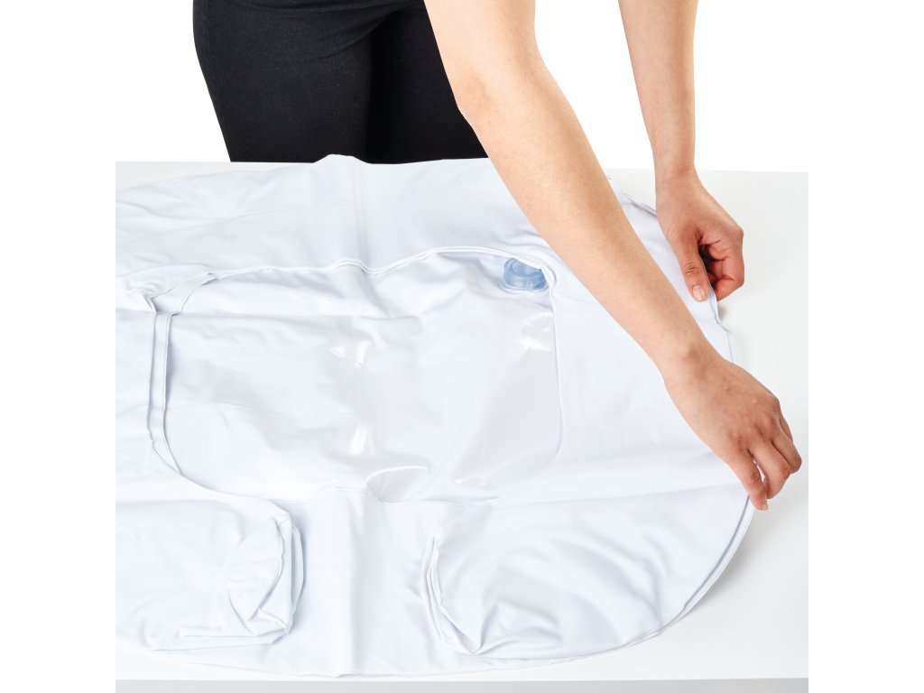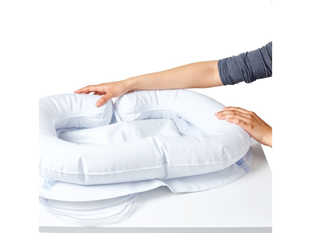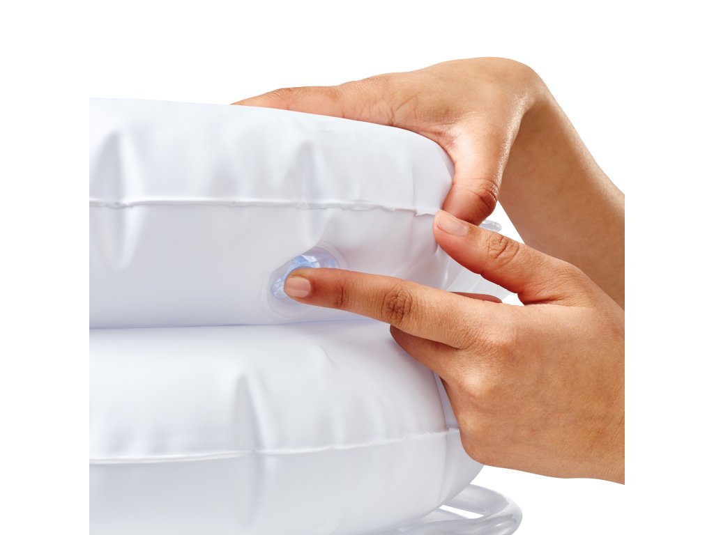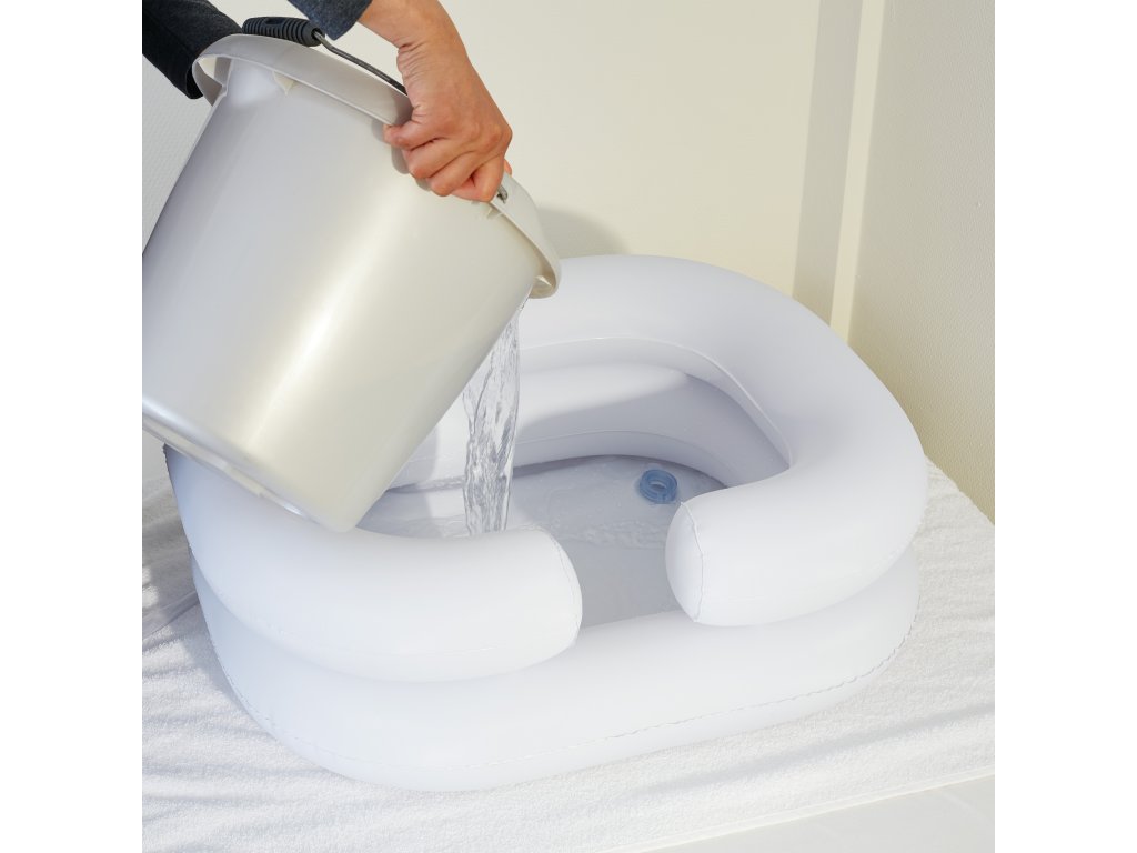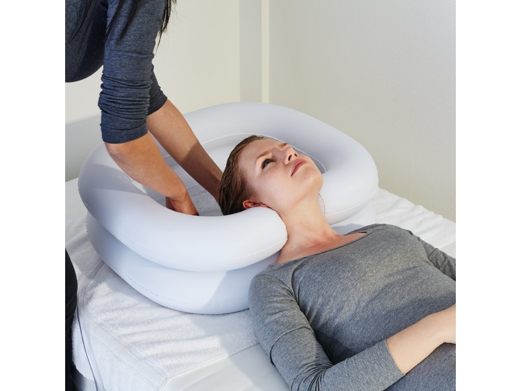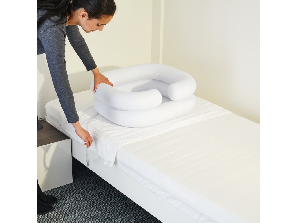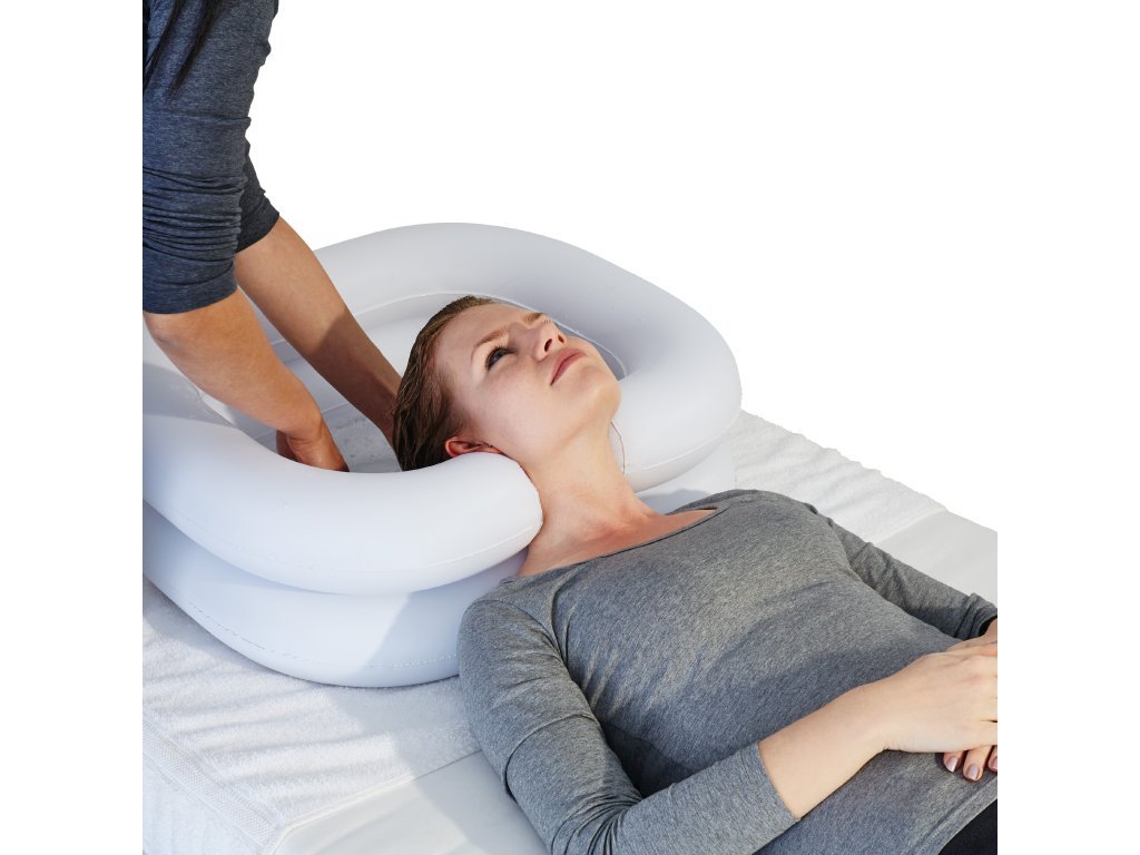 Nafukovací umyvadlo funguje jako skvělá podpora při mytí vlasů a krku vleže. Můžete si určit, jak tvrdě ho nafouknete, aby poskytlo vašemu krku požadovanou a příjemnou oporu. Umyvadlo na vlasy má 1 metr dlouhou vypouštěcí hadici s bezpečnostní zarážkou, která umožňuje vypustit umyvadlo najednou i postupně. Pomůcka na mytí vlasů je lehká, snadno se používá a přenáší.