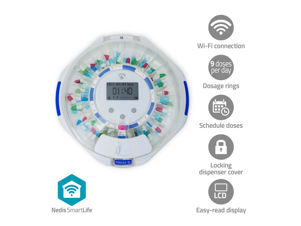 Inteligentní Wi-Fi dávkovač pilulek Nedis je dokonalým řešením pro organizaci a výdej léků, vitamínů a doplňků stravy. Inovativní produkt je navržen tak, aby vám, vaší rodině a vašim pečovatelům pomohl sledovat váš pokrok přímo z chytrého telefonu nebo tabletu. Díky pokročilým funkcím je náš dávkovač tablet dokonalým nástrojem pro ty, kteří hledají bezproblémový způsob správy svých léků.