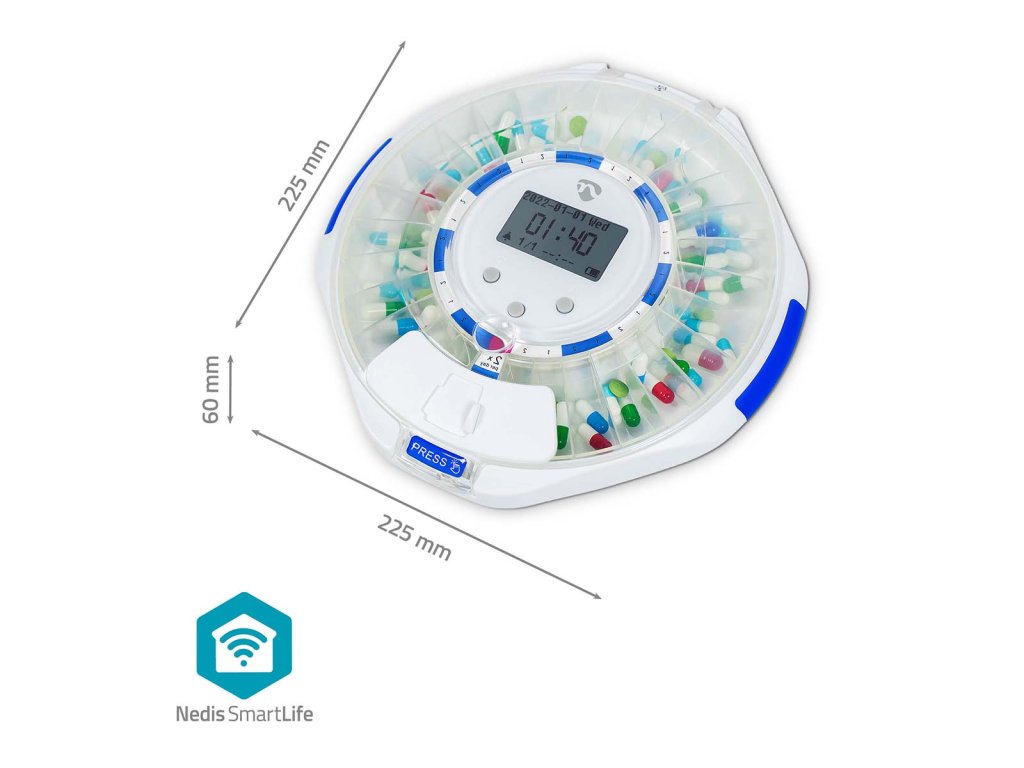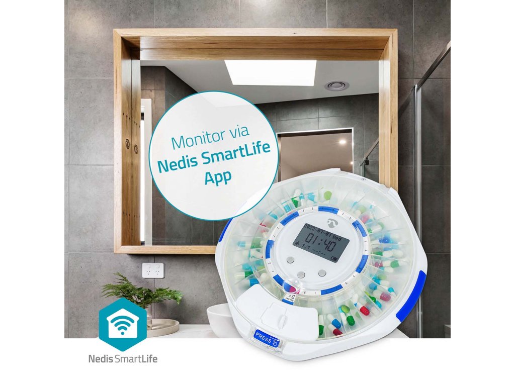 Nedis Dávkovač Pilulek SmartLife | Wi-Fi | 28 Přihrádky | Počet časů poplachu: 9 budíků za den | Hlas / Pípnutí / Světlo | LCD displej | Bílá