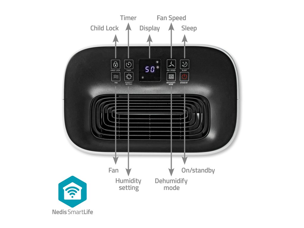 - Ovládání v aplikaci: odvlhčovač můžete přepínat, programovat a sledovat prostřednictvím bezplatné aplikace Nedis® SmartLife™