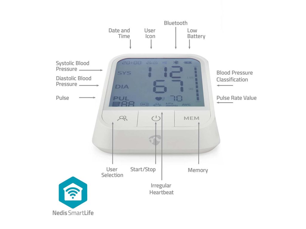 Tento inteligentní monitor krevního tlaku v horní části paže Nedis je klinicky ověřený a nabízí rychlejší výsledky měření díky inteligentní technologii nafukování. Velmi snadno se používá, protože okamžitě informuje uživatele, pokud dojde k chybě aplikace. To je doplněno integrovaným detektorem pohybu, který zajišťuje přesné výsledky měření. Prostřednictvím přenosu dat přes Bluetooth® lze výsledky měření odeslat přímo do aplikace Nedis SmartLife.