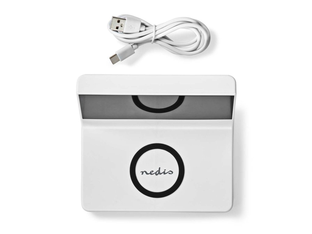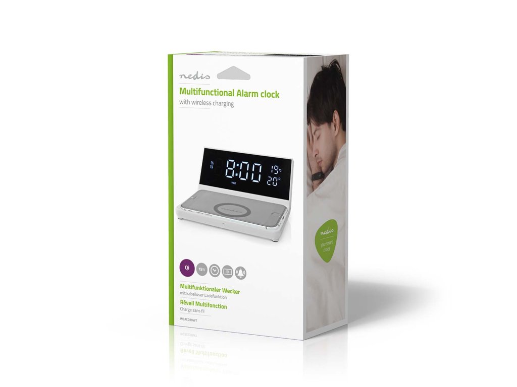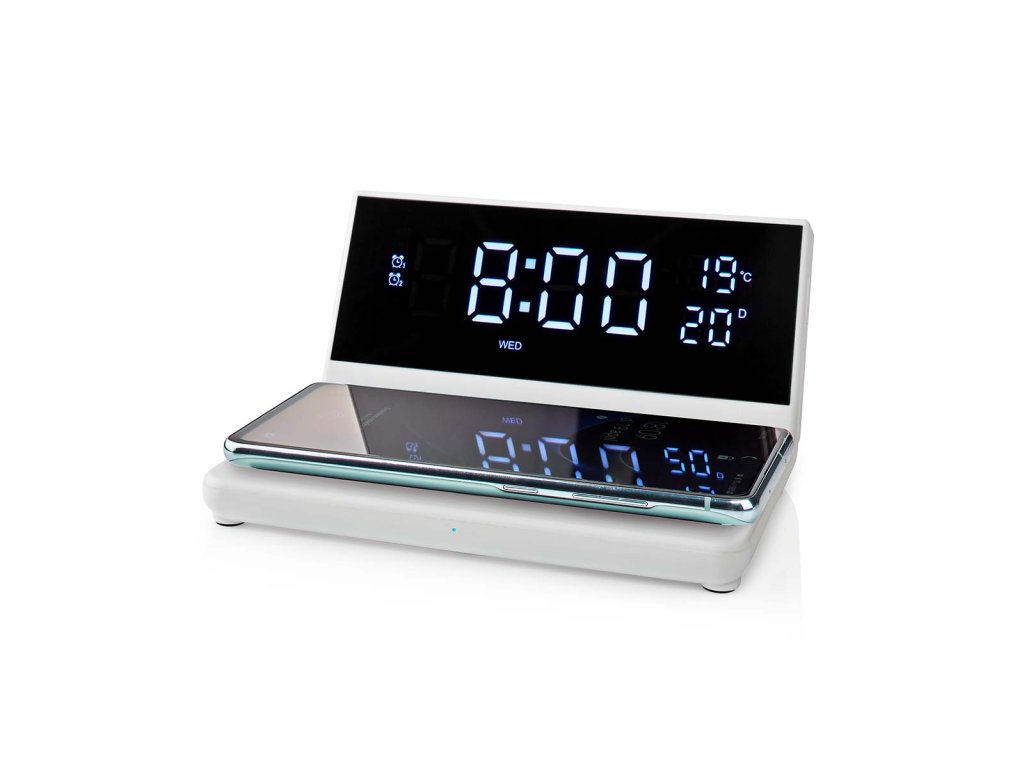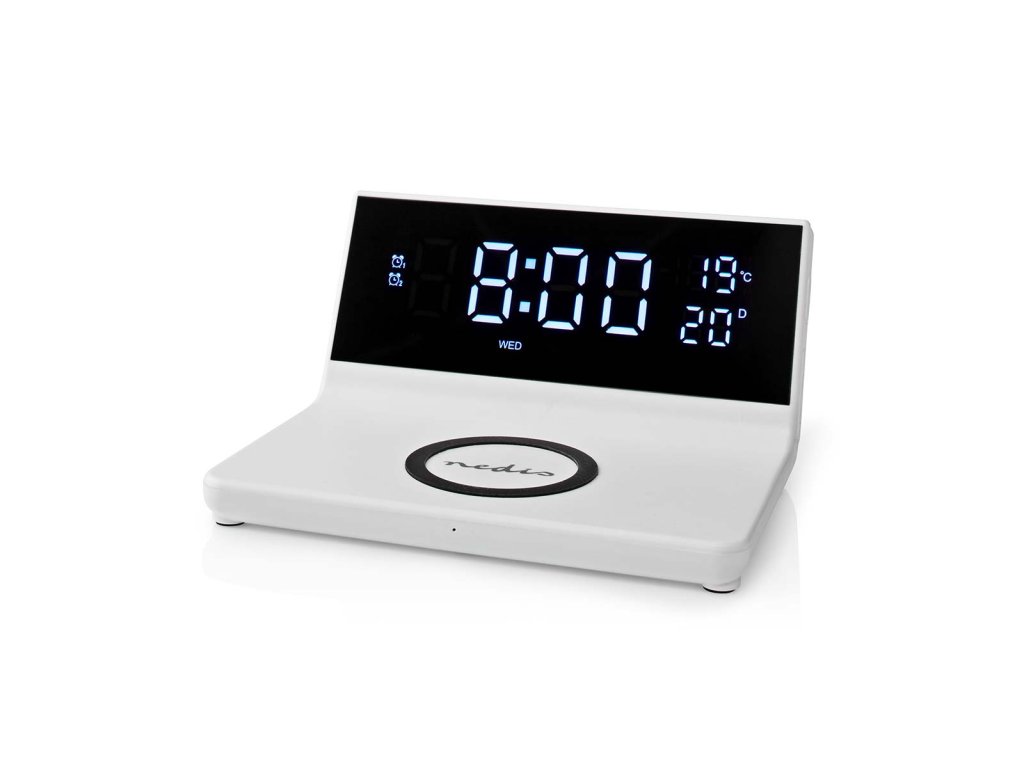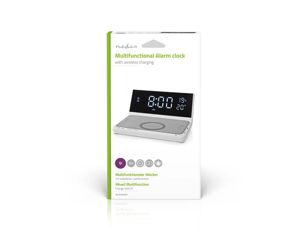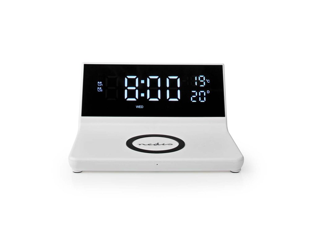 Nedis WCACQ20WT bezdrátová nabíječka mobilu, Qi certifikace, budík, bílá