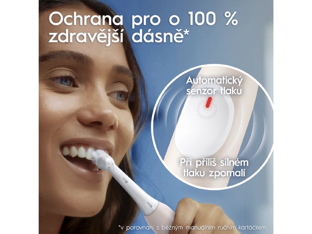 Kartáček je vybaven inteligentním senzorem tlaku, který upozorní při příliš silném čištění a pomáhá tak chránit dásně před podrážděním. Pro maximální komfort nabízí 3 režimy čištění – například jemný nebo každodenní režim – takže si snadno zvolíte intenzitu podle svých potřeb.