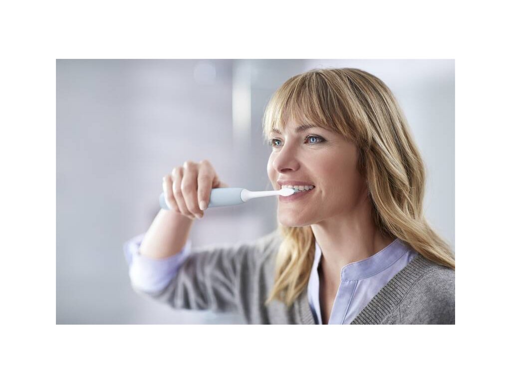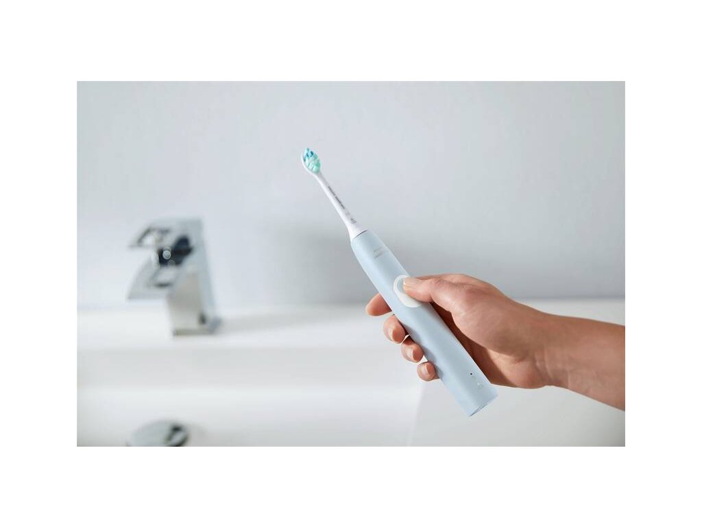 Sonic elektrický zubní kartáček s tlakový senzor, který upozorní, když příliš tlačíte. Technologie Sonicare odstraňuje až 7× více zubního plaku než běžný manuální kartáček díky hustým štětinám a zakřivenému hrotu, který lépe dosáhne i na těžko přístupná místa.