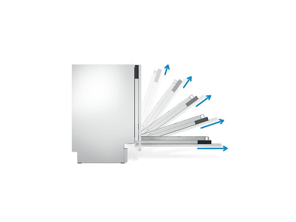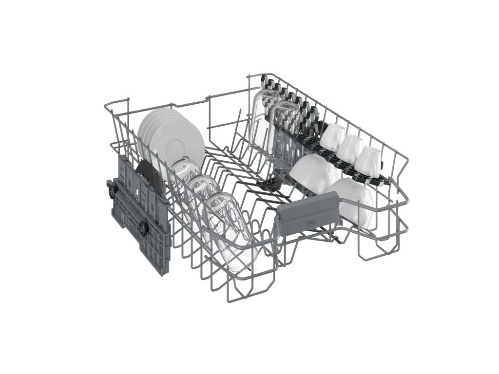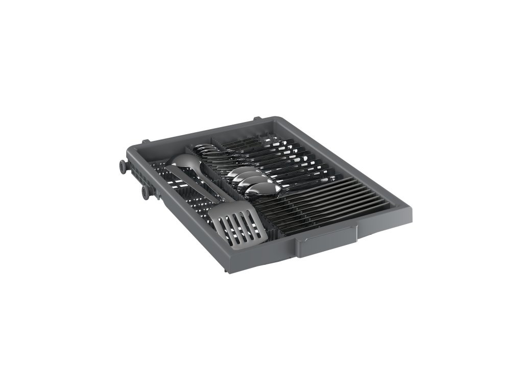 Příborová přihrádka poskytuje dostatek prostoru pro rozložení příborů a drobného nádobí a je vybavená vlastním sprchováním. Díky příhrádce se ve spodním koši uvolní další místo pro velké kusy nádobí.