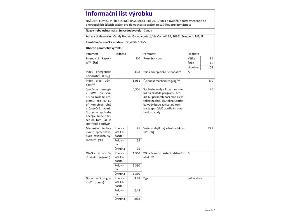 | Spotřeba energie (na cyklus Eco 40-60) | 0,306 kWh |