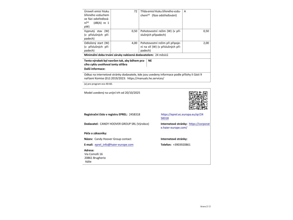 | Hlučnost (fáze odstřeďování) | 72 dB (Třída A) |