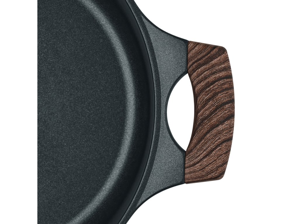 Rukojeti s povrchovou úpravou Soft Touch v designu dřeva nabízejí pohodlný a neklouzavý úchop. Zůstávají chladné na dotek a umožňují bezpečnou manipulaci i při vyšších teplotách. Praktické očko navíc umožňuje snadné zavěšení na háček, takže nádobí nezabírá místo a vaše kuchyně zůstává přehledná.