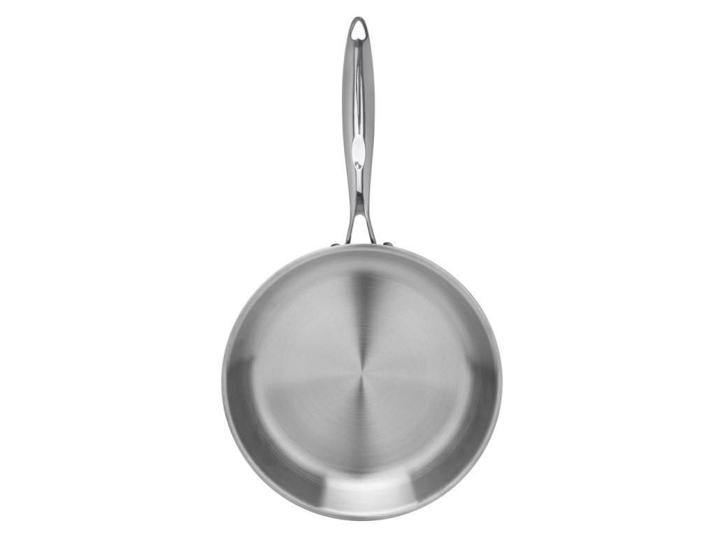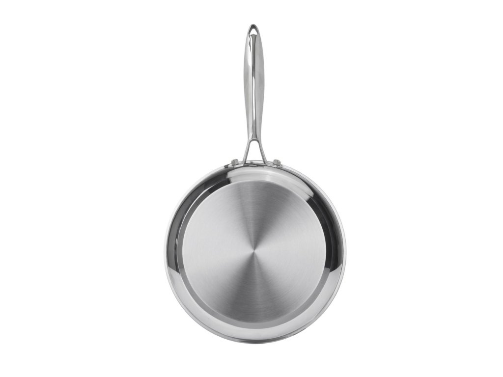 Povrchová úprava na vnitřní straně pánve z nerezové oceli zajišťuje odolnost proti přilnavosti a nikdy nereaguje s jídlem. Nerezová ocel je ideálním povrchem pro vaření, pro opékání, smažení a restování pokrmů, stejně jako pro přípravu omáček. Plné hliníkové jádro o velkém rozměru se táhne napříč dnem a po stranách pánve pro nejlepší distribuci tepla.
