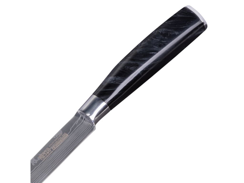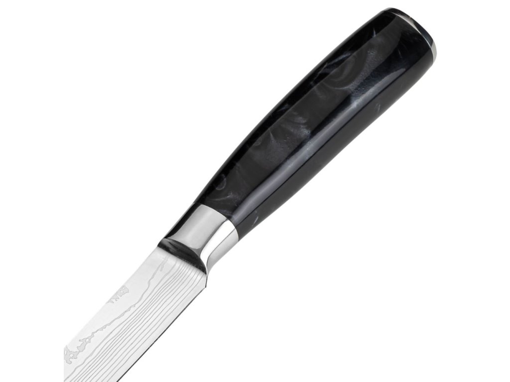 Jedinečný laserový damaškový obtisk a speciálně navržená rukojeť s černým mramorovým kamenem spojují moderní technologii s prastarou praxí výroby damašské oceli.