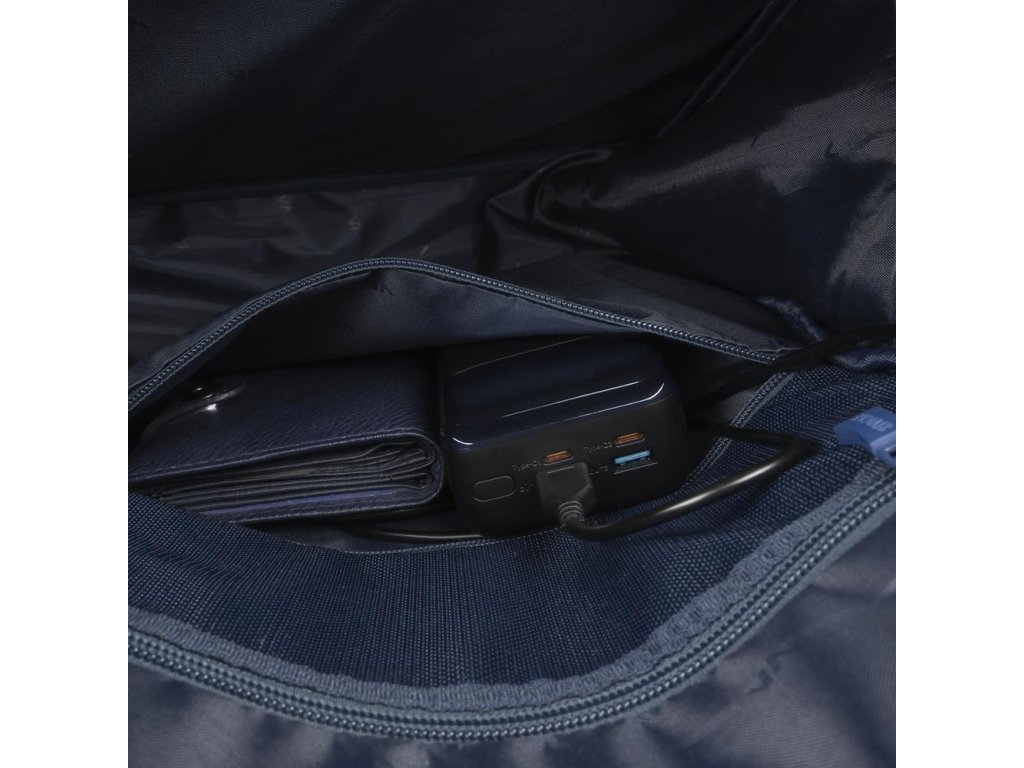 - Dvě přední kapsy – jedna na zip a druhá se zapínáním na suchý zip – pro uložení smartphonu, příslušenství, powerbanky, psacích potřeb a dokumentů