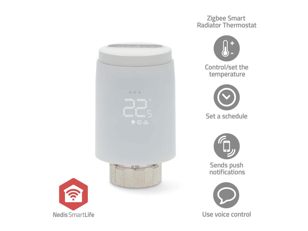 Tím však inovace nekončí. Inteligentní radiátorový termostat se bez námahy integruje do ekosystému vaší chytré domácnosti. Díky kompatibilitě se zkratkami Google Assistant, Amazon Alexa a Siri nebylo ovládání termostatu hlasovými příkazy nikdy pohodlnější. Stačí jej spárovat s bránou Zigbee (WIFIZBxxx) a zkombinovat s dalšími produkty Nedis SmartLife pro skutečně inteligentní a energeticky úsporné domácí prostředí.