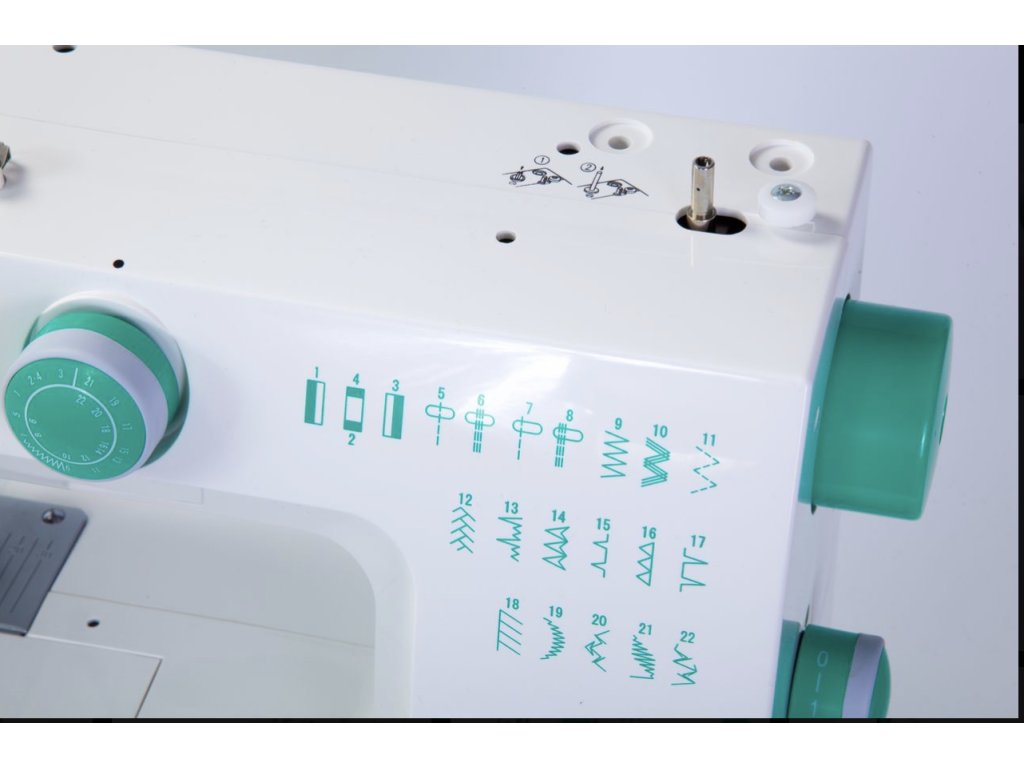 22 šicích programů a 19 typů stehů, včetně pružných, dekorativních a overlock-rohů.