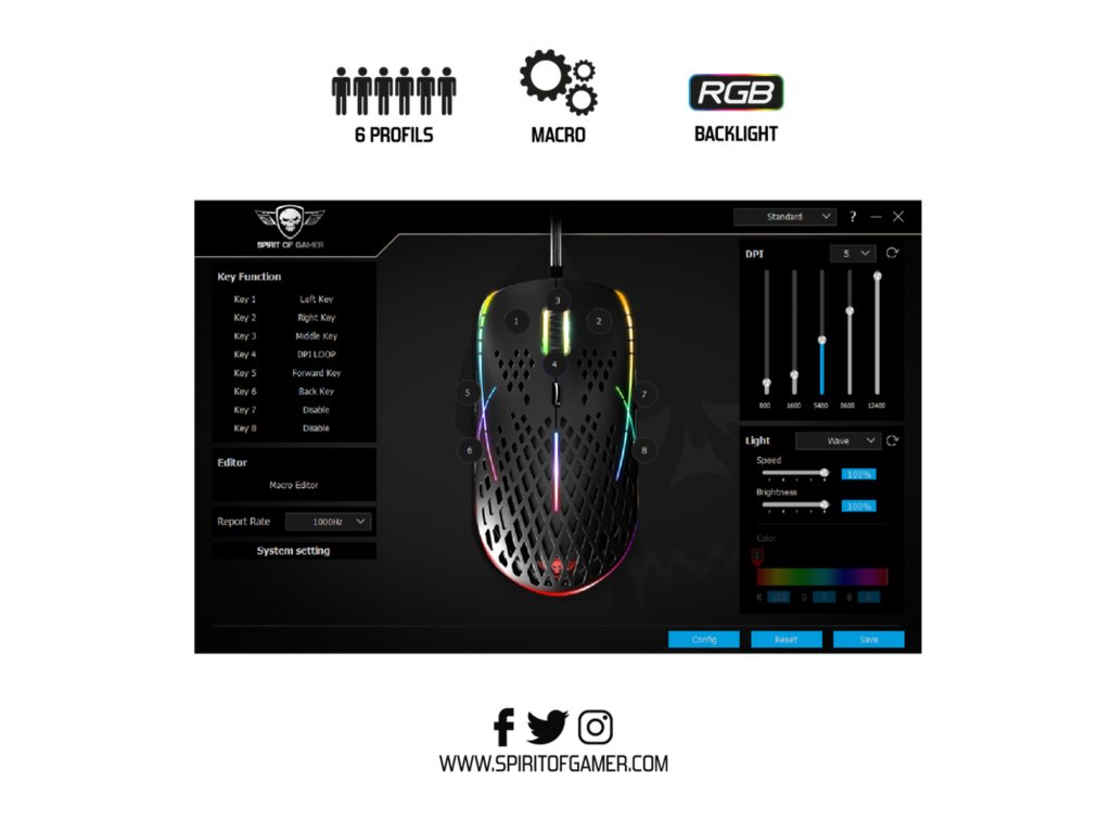 100% přizpůsobitelné podsvícení RGB LED: Myš XPERT M-100 má plně přizpůsobitelné a programovatelné podsvícení LED RGB podsvícení v softwaru M100, který lze stáhnout z webových stránek www.spiritofgamer.com.