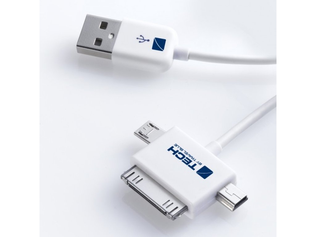 TECH napájecí a datový kabel USB 2.0 A - Apple konektor, micro a mini USB konektory, bílý, 1m
