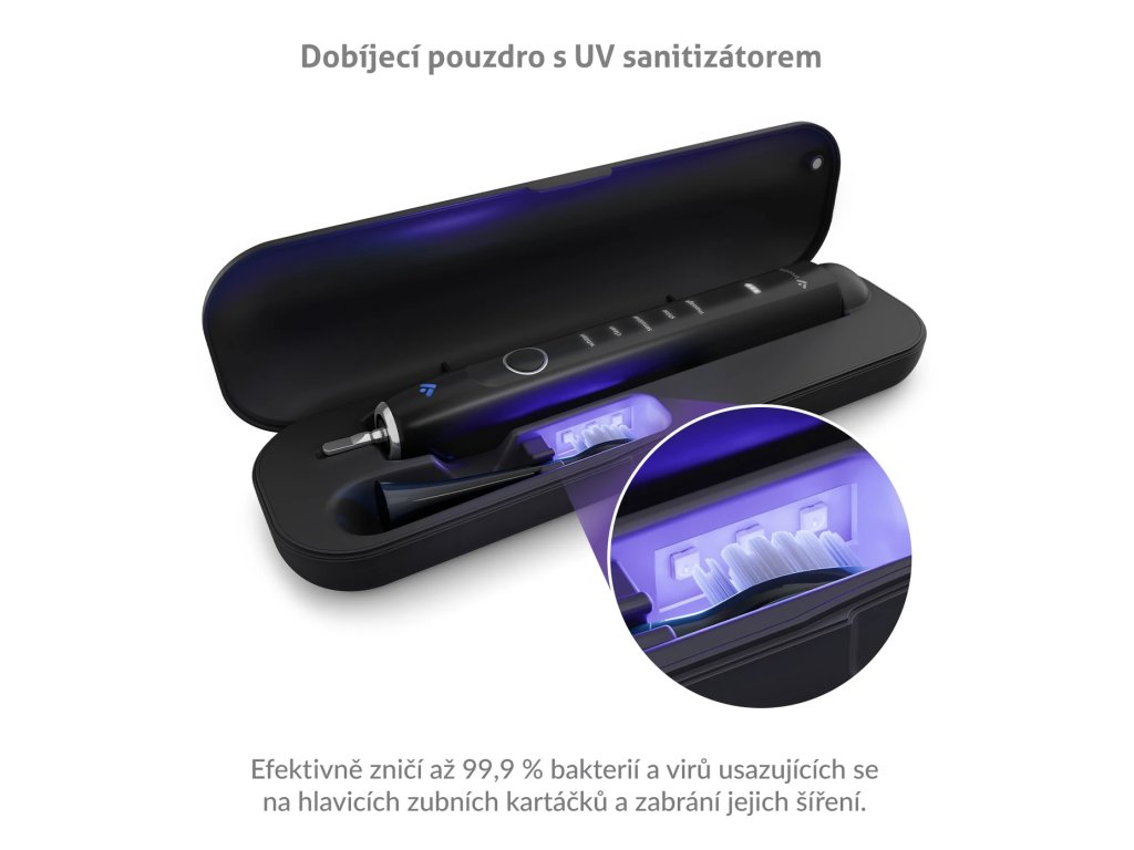 Integrovaná UV sterilizace po každém použití eliminuje až 99,9 % bakterií z kartáčkové hlavice, čímž minimalizuje riziko přenosu nečistot a zajišťuje bezpečné používání pro celou rodinu.