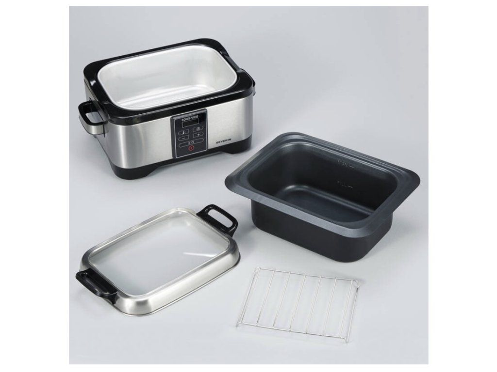 Severin Sous – vide je elektrický hrnec z broušené oceli o objemu 6 litrů, který je určen pro přípravu pokrmů technikou sous – vide. Tato technika spočívá v dlouhodobé přípravě pokrmu při nízkých teplotách, pokrmy se takto vaří i několik hodin. Díky tomuto postupu si výsledný pokrm uchová lépe svoji chuť, texturu a bude šťavnatý. Technikou sous -vide je možné připravovat jak maso, tak i zeleninu nebo třeba brambory. Potraviny, které chcete dát vařit, nejprve vložíte společně s kořením nebo bylinkami do vakuových sáčků. Sáčky se následně vloží do hrnce naplněného vodou a nastaví se požadovaná teplota vaření. Přístroj zajistí, že po celou dobu vaření bude zajištěna nastavená teplota.