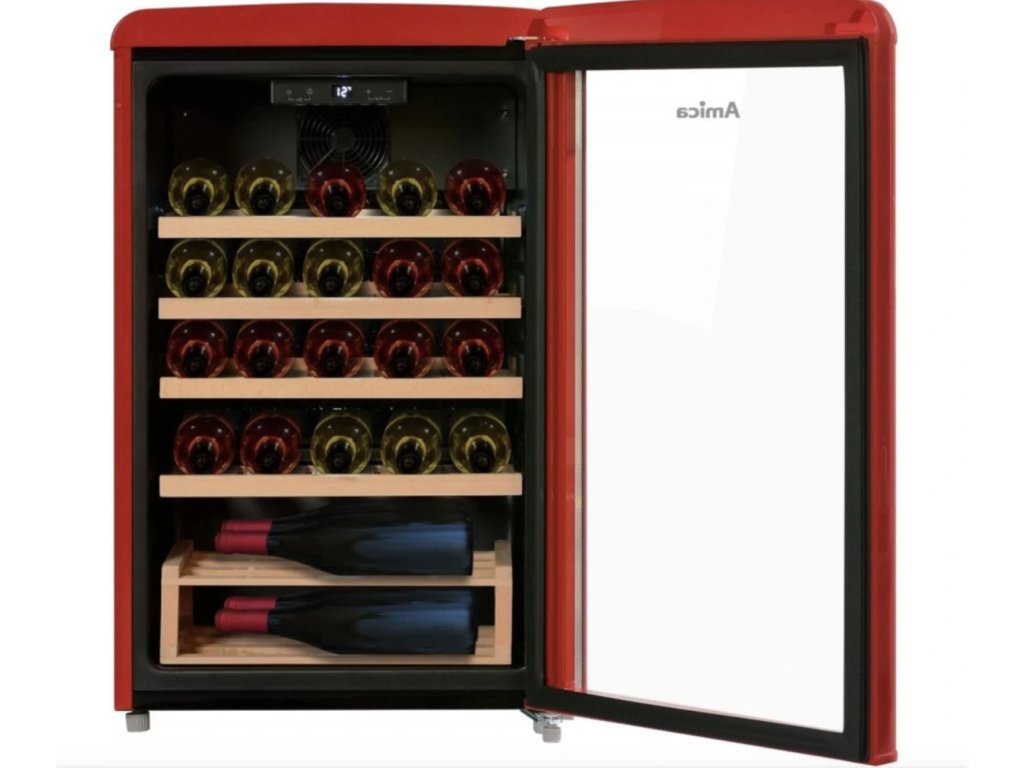 Vinotéka působí výrazně díky červenému retro provedení („chili red“) a decentnímu designu, který evokuje klasickou vinotéku v moderním hávu.